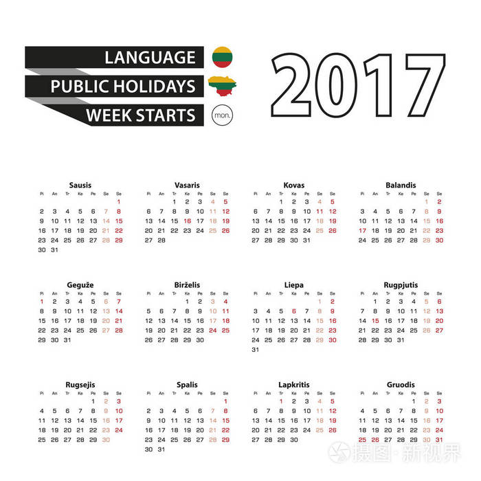 2017 年日历上立陶宛语 与立陶宛在到2017 年的公众假期 每周从星期一开始插画 正版商用图片1rdfeu 摄图新视界