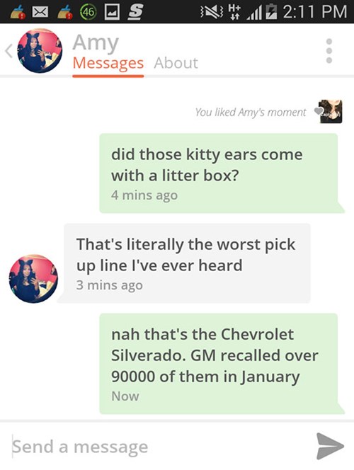 L Verizon 913 Pm Amy Today Do You Have Any Good Pick Up Lines I Could Use On You Nice Face Can I Frame It With My Legs Wow I Don T Like